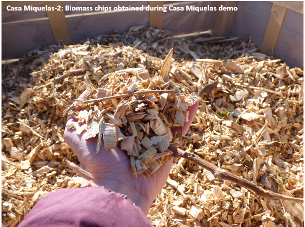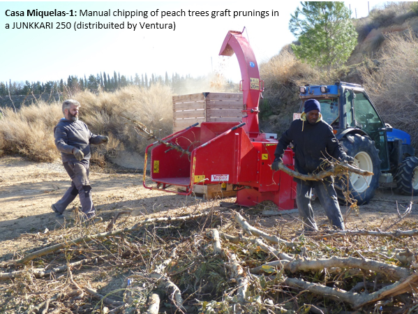 • 1st demo: Manual chipping of peach tree graft prunings at Casa Miquelás, and self-consumption of the wood chips to heat the quail’s farm